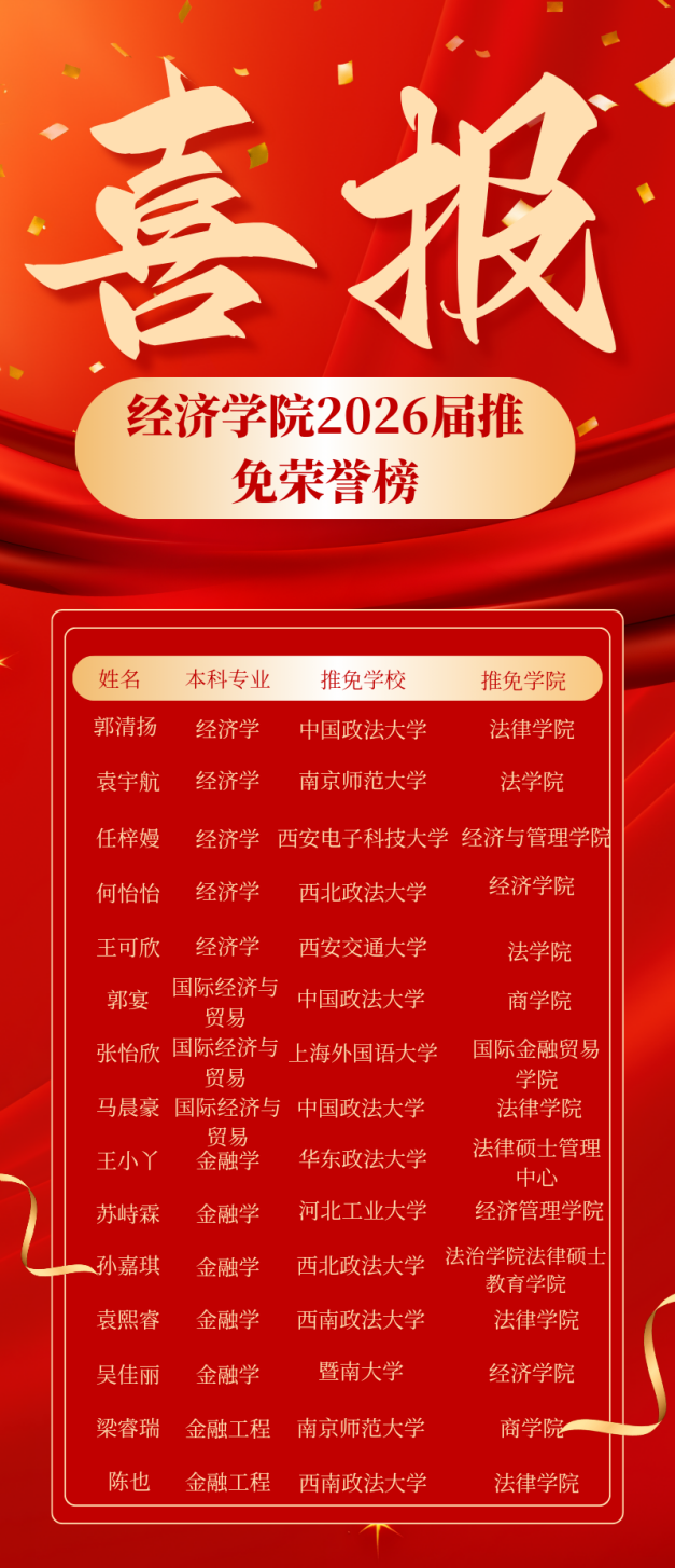 “弘德尚能,经世济民”是经院对我们的期待也是我本科学习时的方向,未来在法大,我会带着这份初心继续深耕,既钻研经济规律,也探索法律与经济的交叉领域。也想把这份力量传递给你:无论是正在为目标奔跑,还是在人生路口徘徊,只要眼里有光、脚下有路,每一步坚持都不会白费。愿我们都能在各自的领域里,保持热爱、奔赴理想,成为既懂经济逻辑、又有责任担当的前行者!