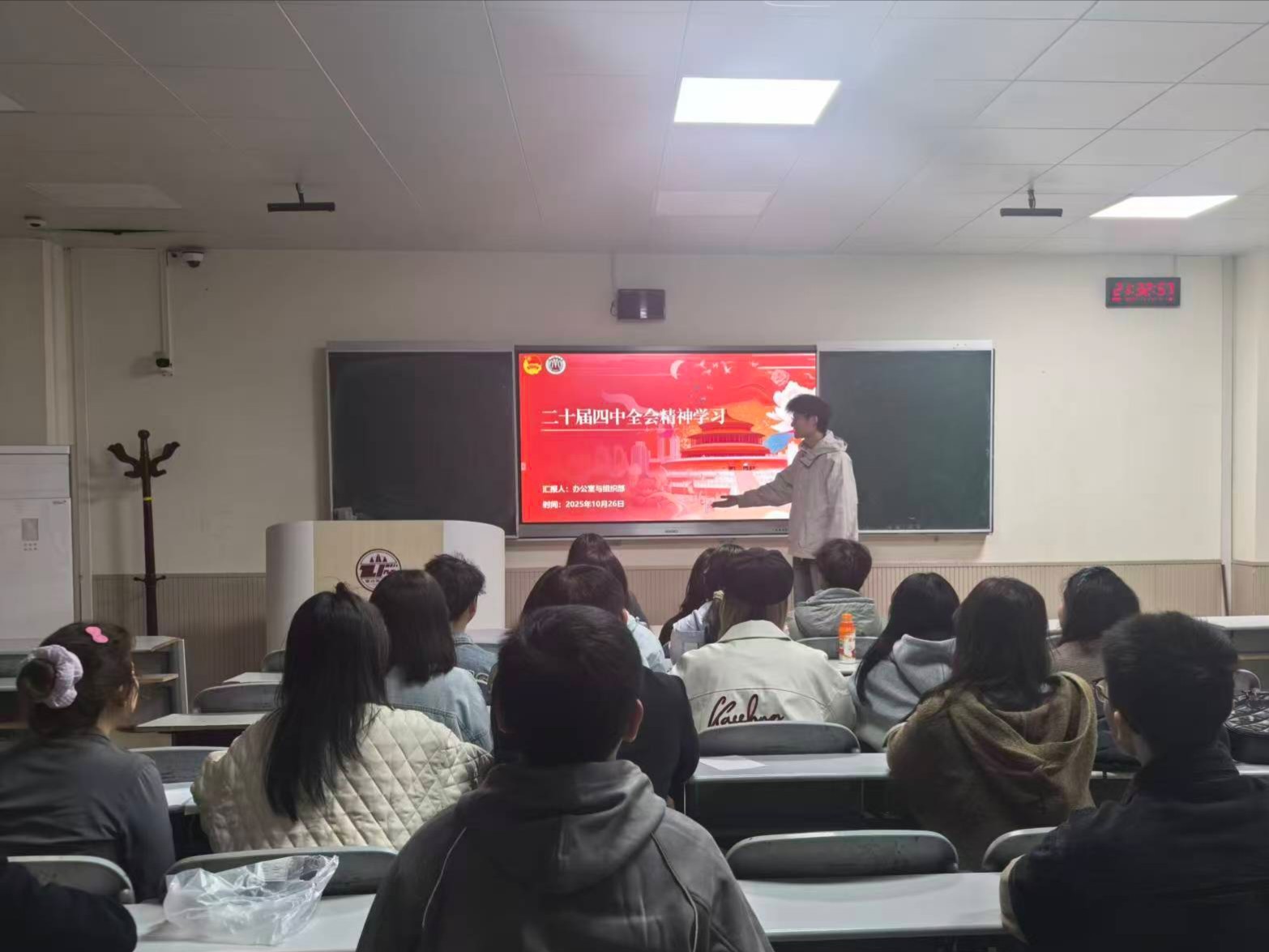 学生会骨干及各部门成员共同研读党的二十届四中全会公报、《中共中央关于进一步全面深化改革、推进中国式现代化的决定》等重要文件。学习会上,大家重点围绕“新质生产力与产业升级”“区域协调发展战略”“高水平对外开放”等关键议题展开研讨。