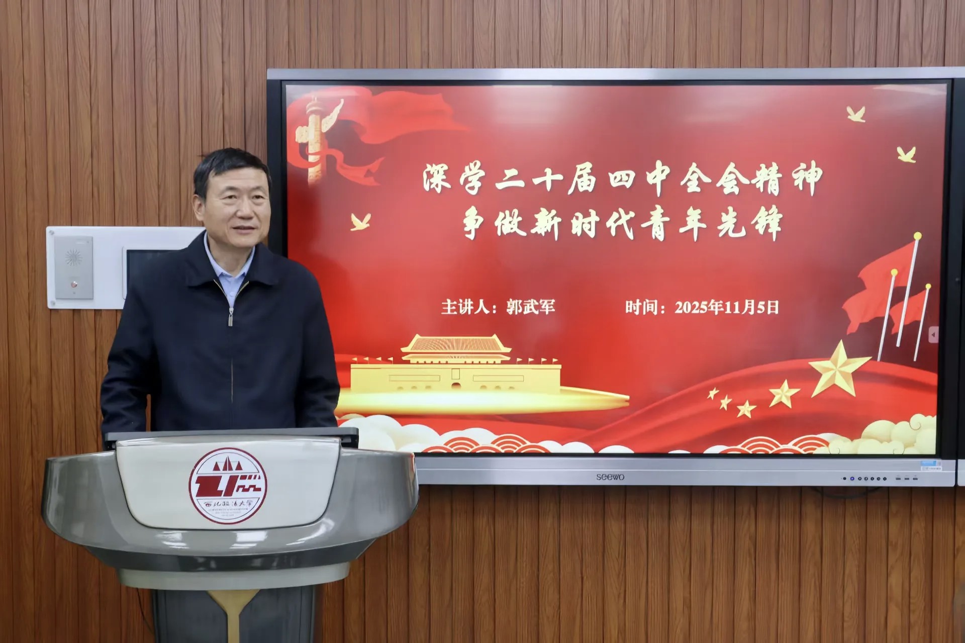 为深入学习贯彻党的二十届四中全会精神,教育引导新生筑牢思想根基、找准青春坐标,11月5日下午,校党委副书记郭武军以“深入学习贯彻党的二十届四中全会精神,争做新时代先锋青年”为题,为赌场