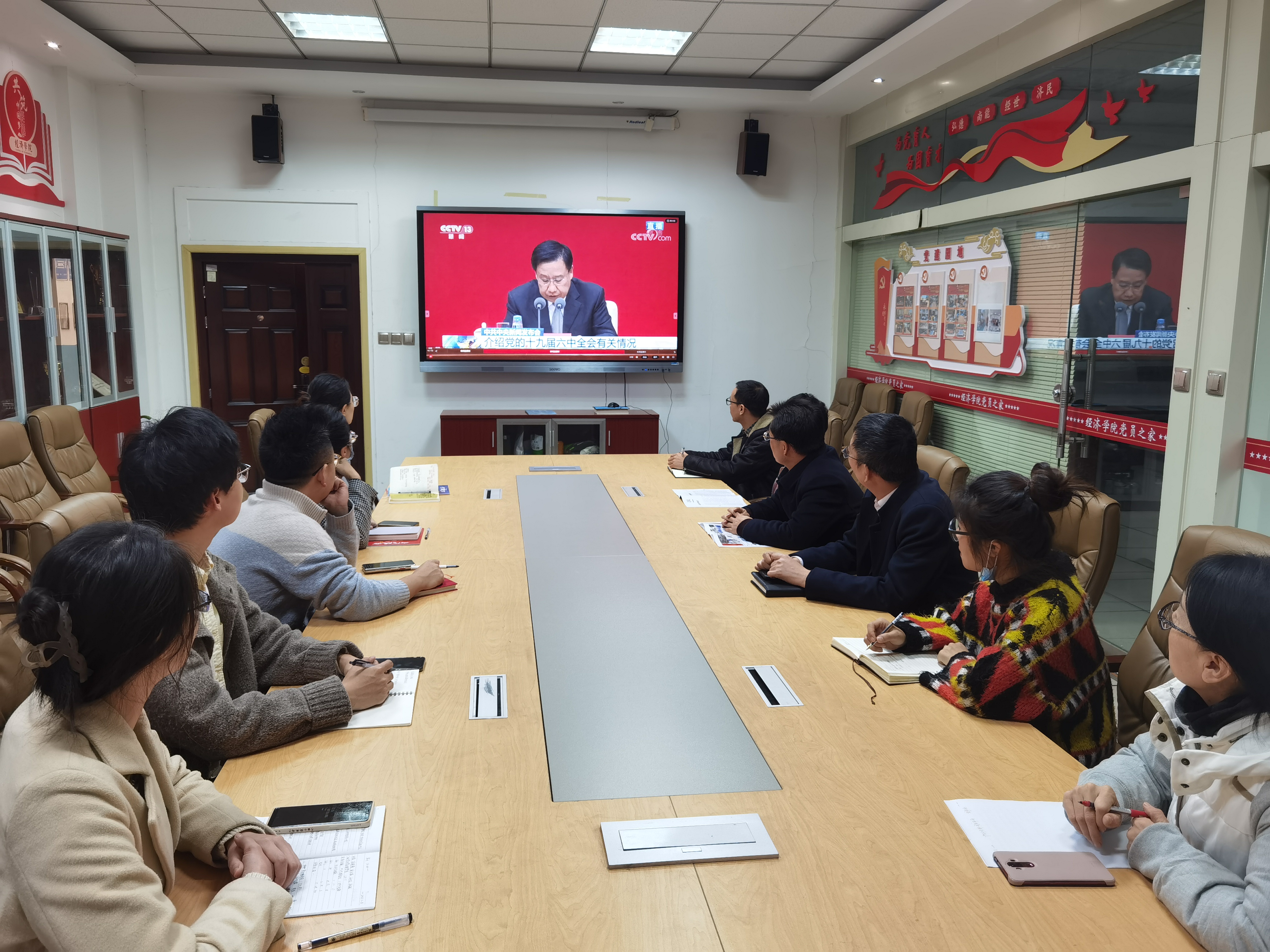 11月12日上午10时,中共中央举行新闻发布会,介绍党的十九届六中全会精神。赌场 组织干部师生在关天会议室集中收看新闻发布会直播,第一时间学习领会党的十九届六中全会精神,学院领导班子成员、组织员、教师党员代表、民主党派及群众代表参加集体学习。