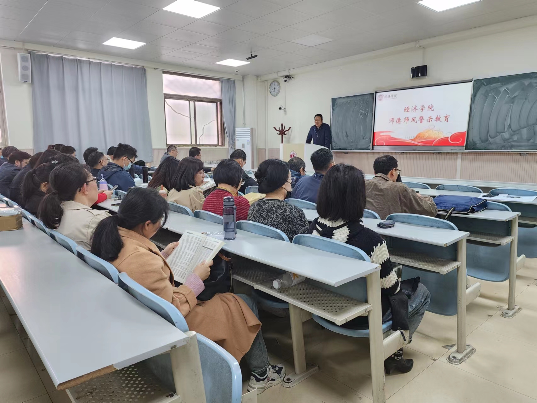 会上,王森书记传达了学校2023年全面从严治党及安全稳定工作会议精神及开展师德师风警示教育的要求,组织全院教职工集中学习了《习近平总书记关于师德师风的重要论述摘编》和《师德师风制度规范及师德失范行为典型案例》手册内容,要求教师对照查摆、以案为鉴,严格遵循教师职业行为准则,加强个人师德建设,增强遵守“十项准则”的思想自觉和行动自觉。